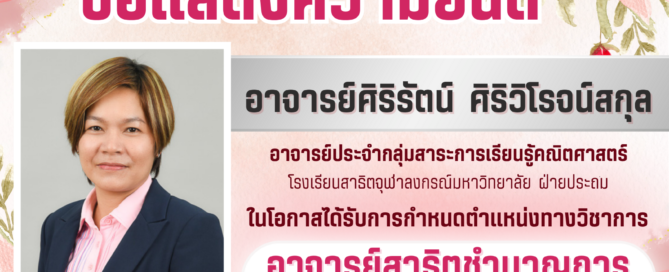 โรงเรียนสาธิตจุฬาลงกรณ์มหาวิทยาลัย ฝ่ายประถม ขอแสดงความยินดีแด่ อาจารย์ศิริรัตน์ ศิริวิโรจน์สกุล อาจารย์ประจำกลุ่มสาระการเรียนรู้คณิตศาสตร์ โรงเรียนสาธิตจุฬาลงกรณ์มหาวิทยาลัย ฝ่ายประถม ในโอกาสได้รับการกำหนดตำแหน่งทางวิชาการ “อาจารย์สาธิตชำนาญการ” [...]