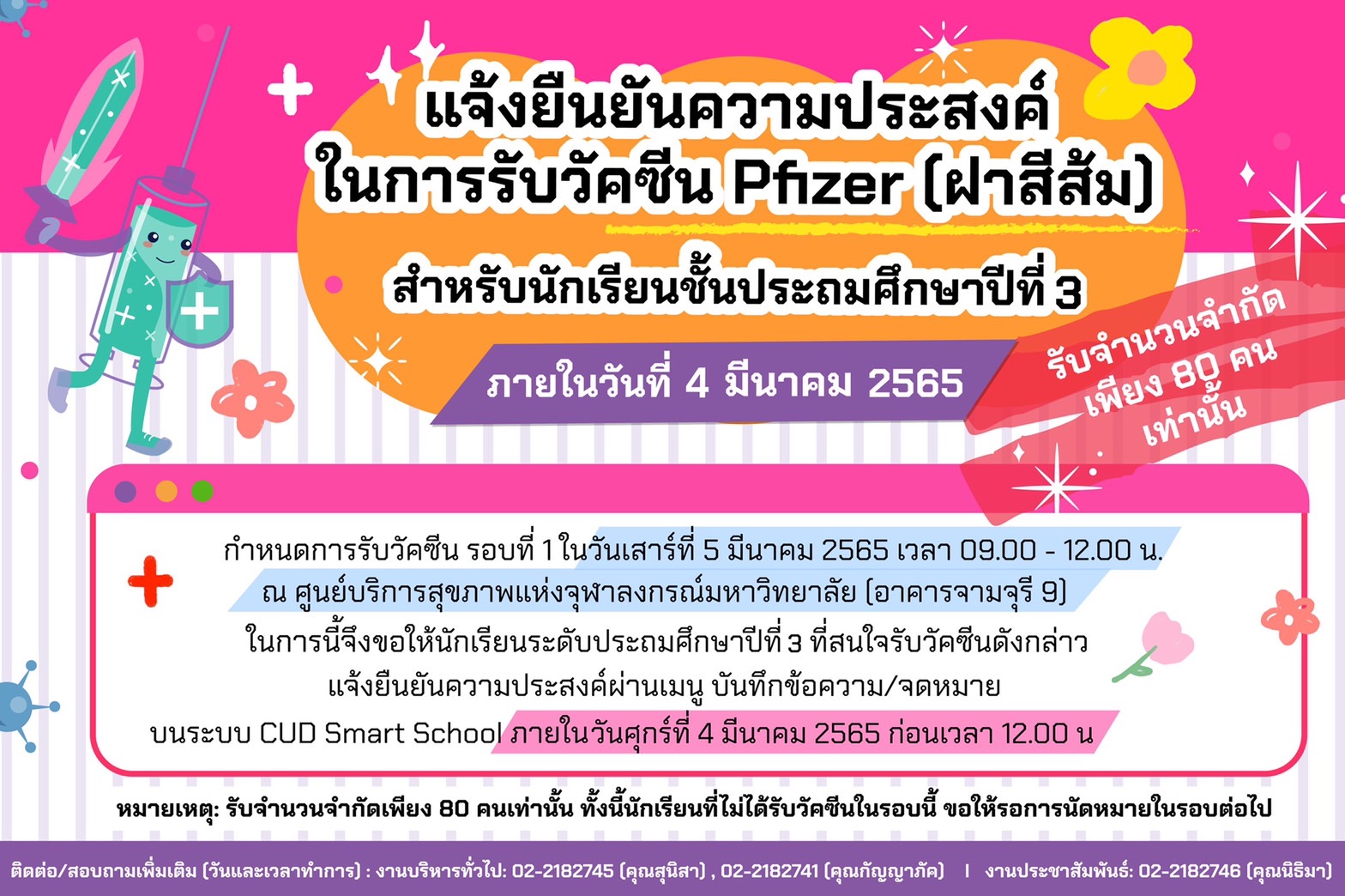 ขอความร่วมมือผู้ปกครองนักเรียนชั้นประถมศึกษาปีที่ 3 แจ้งยืนยันความประสงค์ในการรับวัคซีน Pfizer (ฝาสีส้ม) By Web Master|2022-03-14T03:09:38+07:00March 3, 2022|ข่าวประชาสัมพันธ์| View Larger Image ขอความร่วมมือผู้ปกครองนักเรียนชั้นประถมศึกษาปีที่ 3 แจ้งยืนยันความประสงค์ในการรับวัคซีน Pfizer (ฝาสีส้ม) ผ่านเมนู บันทึกข้อความ / จดหมาย ในระบบ CUD Smart School (https://cud.onsmart.school/login) ภายในวันศุกร์ที่ 4 มีนาคม 2565 ก่อนเวลา 12.00 น. กำหนดการรับวัคซีน รอบที่ 1 วันเสาร์ที่ 5 มีนาคม 2565 เวลา 09.00 – 12.00 น. ณ ศูนย์บริการสุขภาพแห่งจุฬาลงกรณ์มหาวิทยาลัย (อาคารจามจุรี 9) ❗️❗️ หมายเหตุ : รับจำนวนจำกัดเพียง 80 คนเท่านั้น ทั้งนี้นักเรียนที่ไม่ได้รับวัคซีนในรอบนี้ ขอให้รอการนัดหมทายในรอบต่อไป ❗️❗️ ติดต่อสอบถามเพิ่มเติม (วันและเวลาทำการ) งานบริหารทั่วไป 02-218-2745 (คุณสุนิสา), 02-218-2741 (คุณกัญญาภัค) งานประชาสัมพันธ์ 02-218-2746 (คุณนิธิมา)
