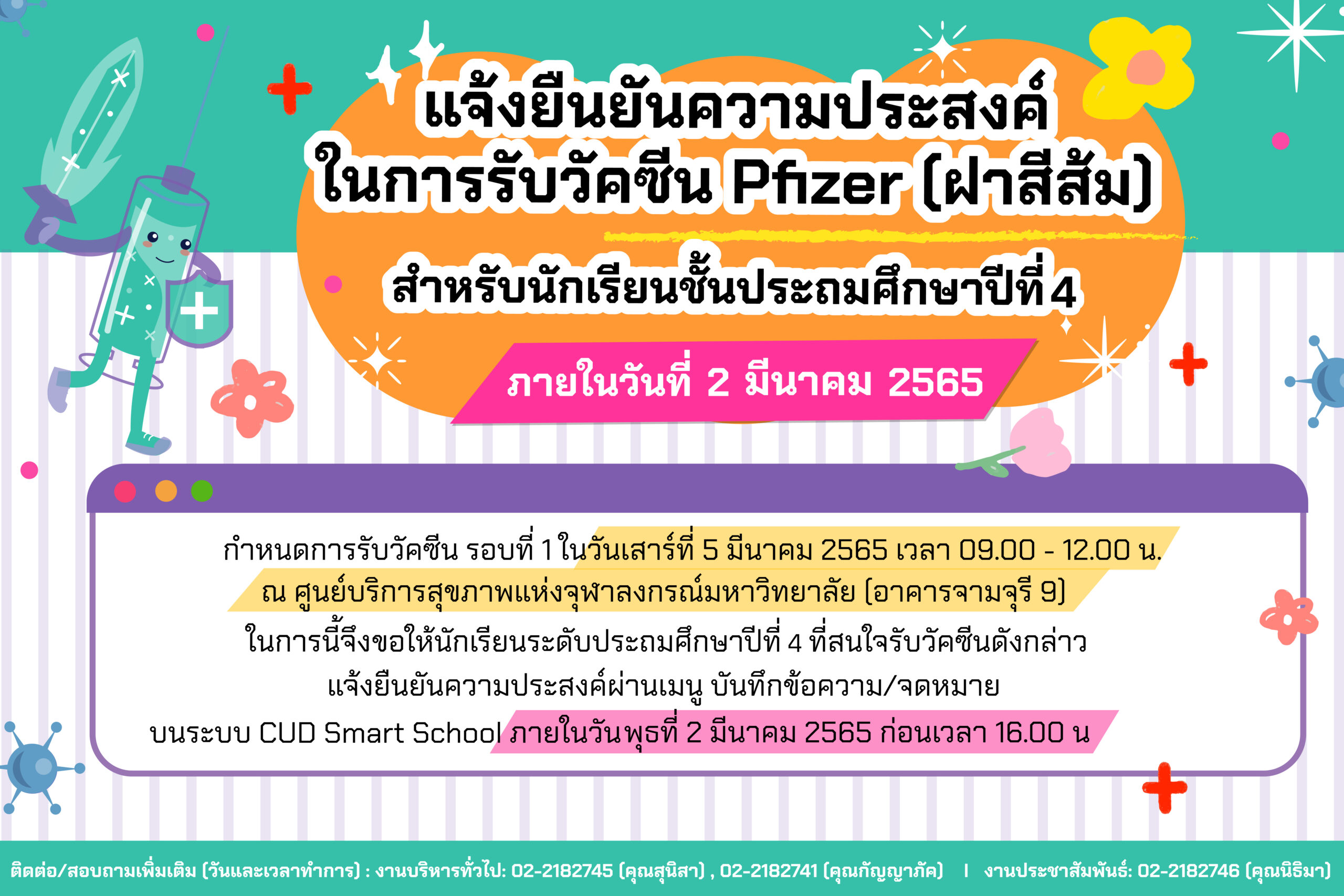 ขอความร่วมมือผู้ปกครองนักเรียนชั้นประถมศึกษาปีที่ 4 แจ้งยืนยันความประสงค์ในการรับวัคซีน Pfizer (ฝาสีส้ม) By Web Master|2022-03-14T03:09:30+07:00February 28, 2022|ข่าวประชาสัมพันธ์| View Larger Image ขอความร่วมมือผู้ปกครองนักเรียนชั้นประถมศึกษาปีที่ 4 แจ้งยืนยันความประสงค์ในการรับวัคซีน Pfizer (ฝาสีส้ม) ผ่านเมนู บันทึกข้อความ / จดหมาย ในระบบ CUD Smart School (https://cud.onsmart.school/login) ภายในวันพุธที่ 2 มีนาคม 2565 ก่อนเวลา 16.00 น. กำหนดการรับวัคซีน รอบที่ 1 วันเสาร์ที่ 5 มีนาคม 2565 เวลา 09.00 – 12.00 น. ณ ศูนย์บริการสุขภาพแห่งจุฬาลงกรณ์มหาวิทยาลัย (อาคารจามจุรี 9) ติดต่อสอบถามเพิ่มเติม (วันและเวลาทำการ) งานบริหารทั่วไป 02-218-2745 (คุณสุนิสา), 02-218-2741 (คุณกัญญาภัค) งานประชาสัมพันธ์ 02-218-2746 (คุณนิธิมา)