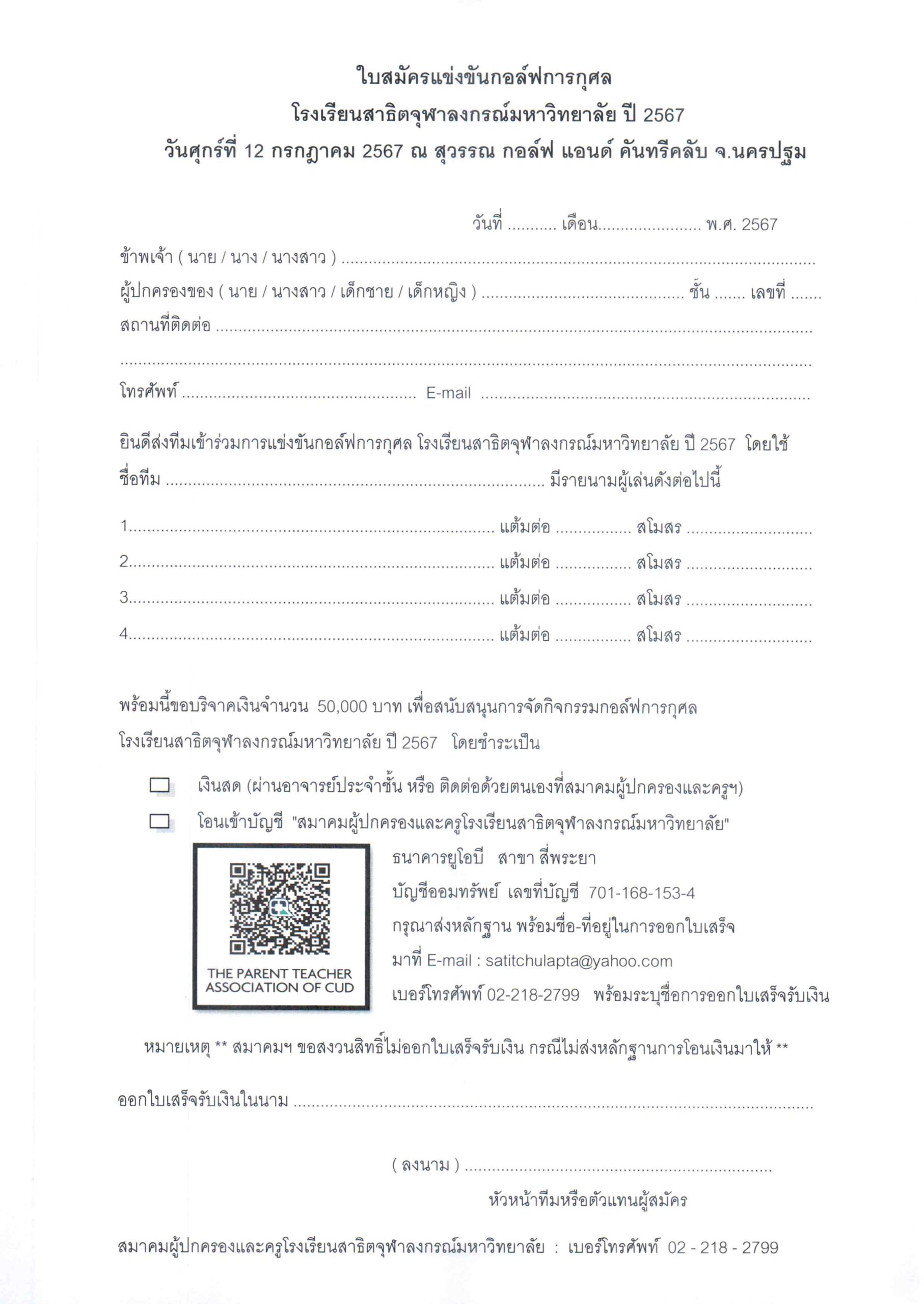 สมาคมฯ ขอเชิญชวนผู้ปกครองทุกท่านเข้าร่วมกิจกรรมในครั้งนี้ ซึ่งจัดการแข่งขันแบบ ประเภททีม 4 คน ไม่จำกัดเพศ ทีมละ 50,000 บาท หากท่านผู้ปกครองไม่ประสงค์จะส่งทีมเข้าแข่งขัน แต่ยินดีที่จะให้ความอนุเคราะห์สนับสนุนการแข่งขัน เป็นจำนวนเงินตั้งแต่ 50,000 บาท ขึ้นไป คณะกรรมการจะจัดการประชาสัมพันธ์กิจการหรือผลิตภัณฑ์ของท่าน โดยติดป้าย LOGO สินค้าในบริเวณงาน หรือบริจาคให้การสนับสนุนกิจกรรม ทั้งนี้ สมาคมฯได้แนบเอกสารใบสมัครและแบบฟอร์มขอความอนุเคราะห์มาพร้อมกันนี้แล้ว โปรดแจ้งความประสงค์ของท่านภายใน วันศุกร์ที่ 5 กรกฎาคม 2567 ผ่านอาจารย์ประจำชั้นหรือติดต่อด้วยตนเองที่สมาคมผู้ปกครองและครูโรงเรียนสาธิตจุฬาลงกรณ์มหาวิทยาลัย