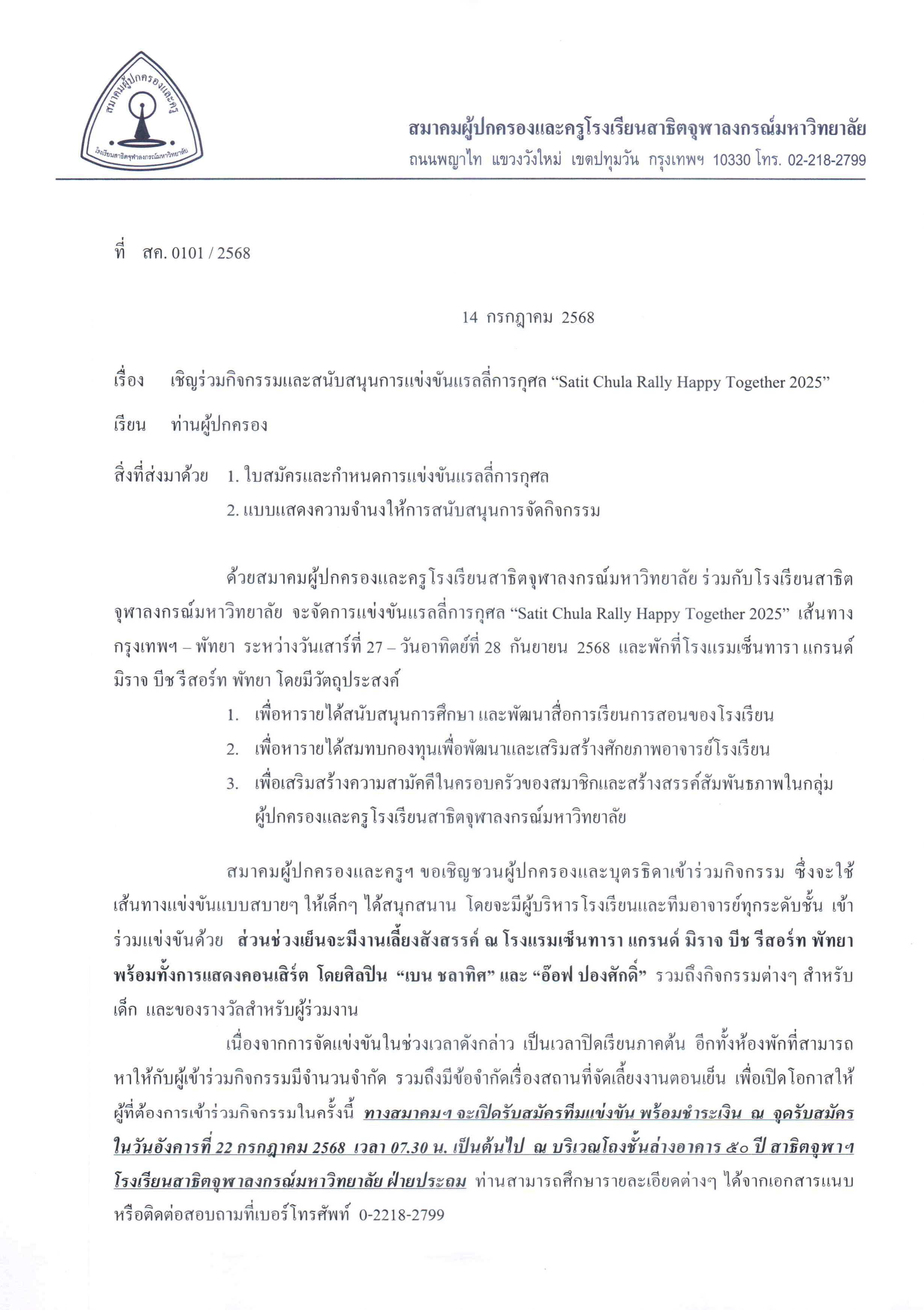 ด้วยสมาคมผู้ปกครองและครูโรงเรียนสาธิตจุฬาลงกรณ์มหาวิทยาลัย ร่วมกับโรงเรียนสาธิตจุฬาลงกรณ์มหาวิทยาลัย จะจัดการแข่งขันแรลลี่การกุศล “Satit Chula Rally Happy Together 2025” เส้นทาง กรุงเทพฯ – พัทยา ระหว่างวันเสาร์ที่ 27 – วันอาทิตย์ที่ 28 กันยายน 2568 และพักที่โรงแรมเซ็นทารา แกรนด์ มิราจ บีช รีสอร์ท พัทยา โดยมีวัตถุประสงค์