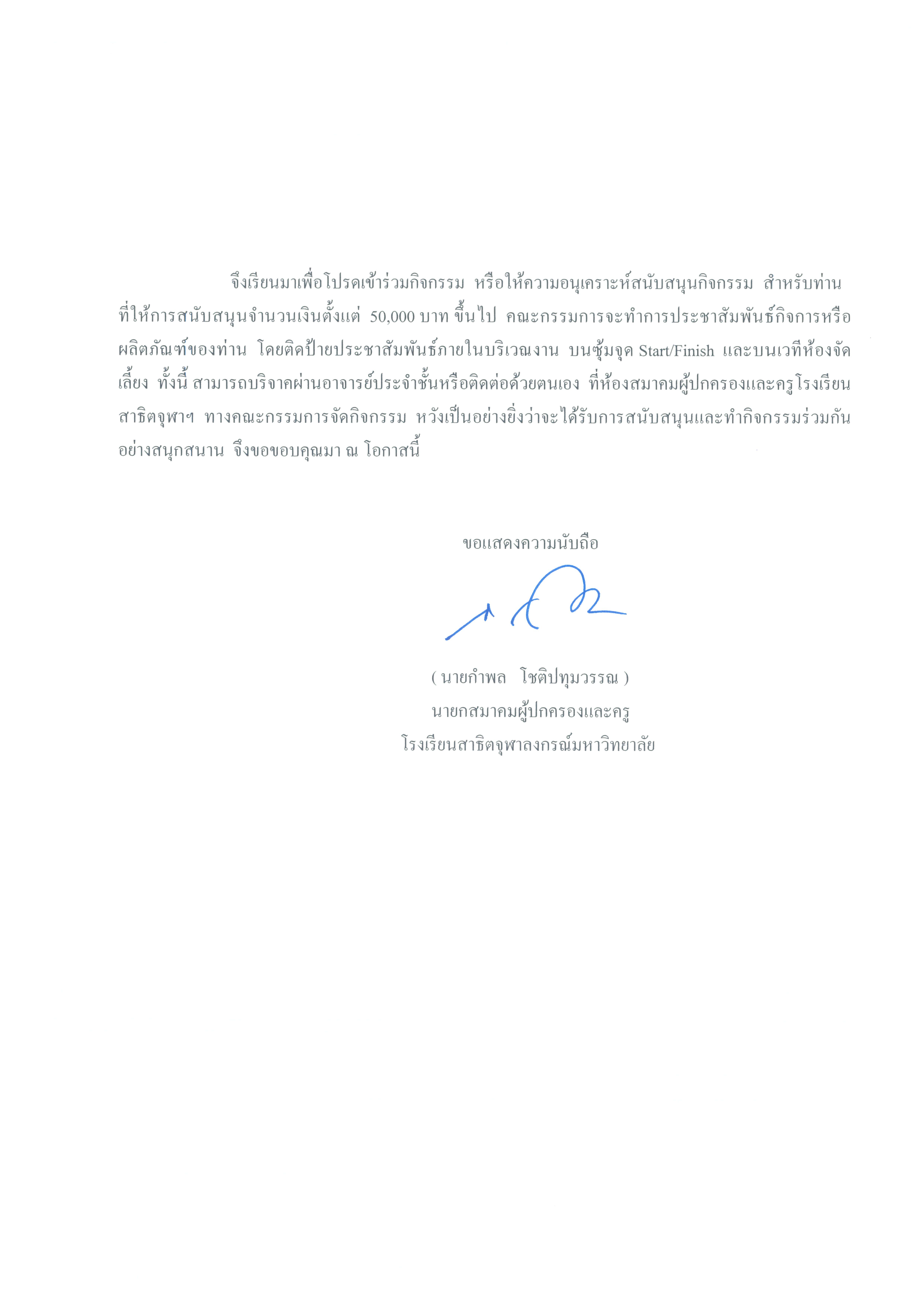 จึงเรียนมาเพื่อโปรดเข้าร่วมกิจกรรม หรือให้ความอนุเคราะห์สนับสนุนกิจกรรม สำหรับท่านที่ให้การสนับสนุนจำนวนเงินตั้งแต่ 50,000 บาท ขึ้นไป คณะกรรมการจะทำการประชาสัมพันธ์กิจการหรือผลิตภัณฑ์ของท่าน โดยติดป้ายประชาสัมพันธ์ภายในบริเวณงาน บนซุ้มจุด Start/Finish และบนเวทีห้องจัดเลี้ยง ทั้งนี้ สามารถบริจาคผ่านอาจารย์ประจำชั้นหรือติดต่อด้วยตนเอง ที่ห้องสมาคมผู้ปกครองและครูโรงเรียนสาธิตจุฬาฯ ทางคณะกรรมการจัดกิจกรรม หวังเป็นอย่างยิ่งว่าจะได้รับการสนับสนุนและทำกิจกรรมร่วมกันอย่างสนุกสนาน จึงขอขอบคุณมา ณ โอกาสนี้