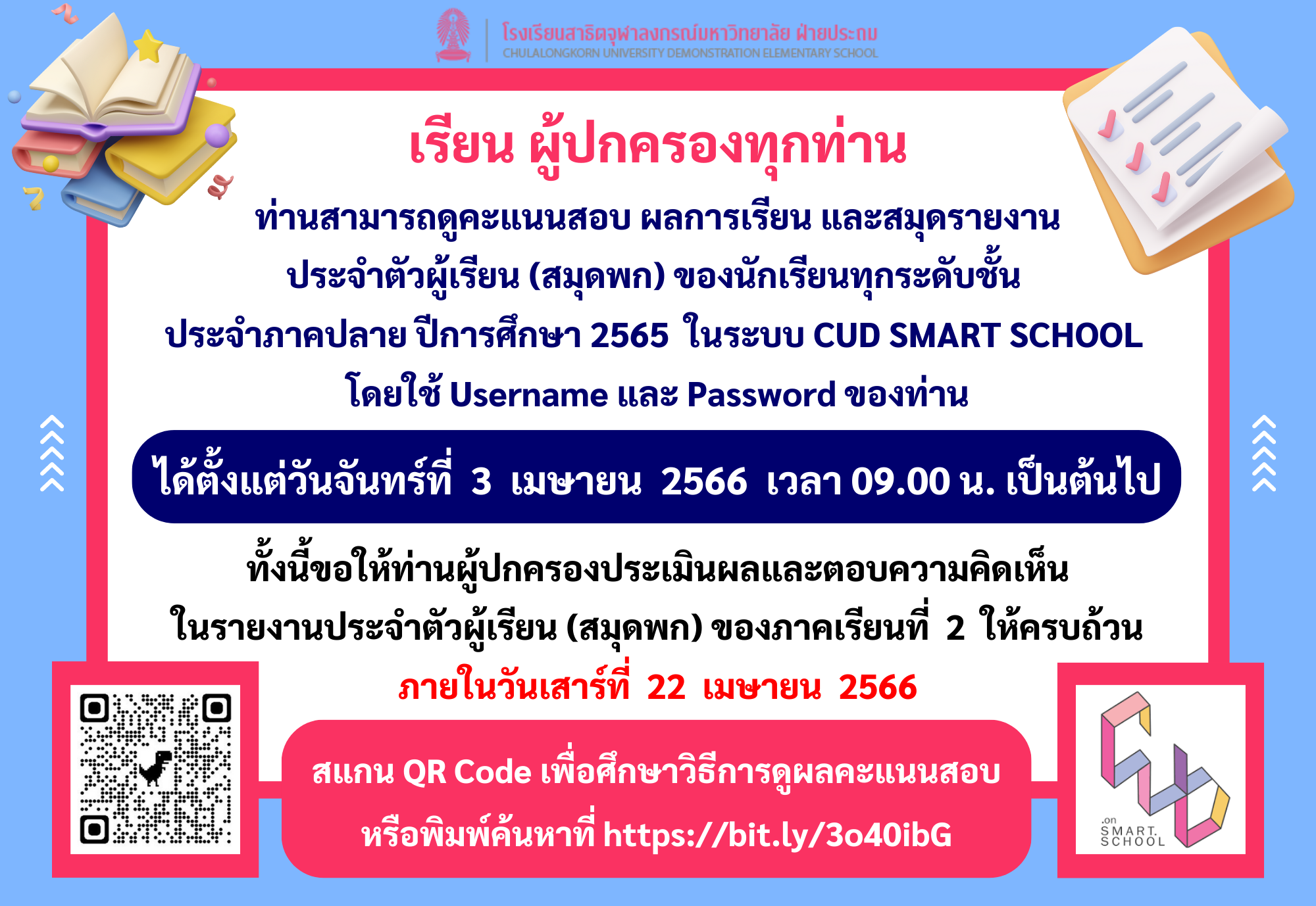 ท่านสามารถดูคะแนนสอบ ผลการเรียน และสมุดรายงานประจำตัวผู้เรียน (สมุดพก) ของนักเรียนทุกระดับชั้น ประจำภาคปลาย ปีการศึกษา 2565 ในระบบ CUD SMART SCHOOL (https://cud.onsmart.school) ได้ตั้งแต่วันจันทร์ที่ 3 เมษายน 2566 เวลา 09.00 น. เป็นต้นไป โดยใช้ Username และ Password ของท่าน